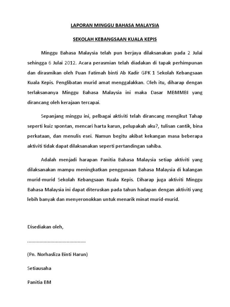 Sebagai setiausaha persatuan kamu dikehendaki menulis sebuah laporan tentang. CADANGAN PENAMBAHBAIKAN Pada tahun 2012 dicadangkan agar Program Minggu Bahasa Melayu ini dapat dijalankan pada awal tahun bagi memantapkan lagi. Muat turun halaman 1-28 di AnyFlip.